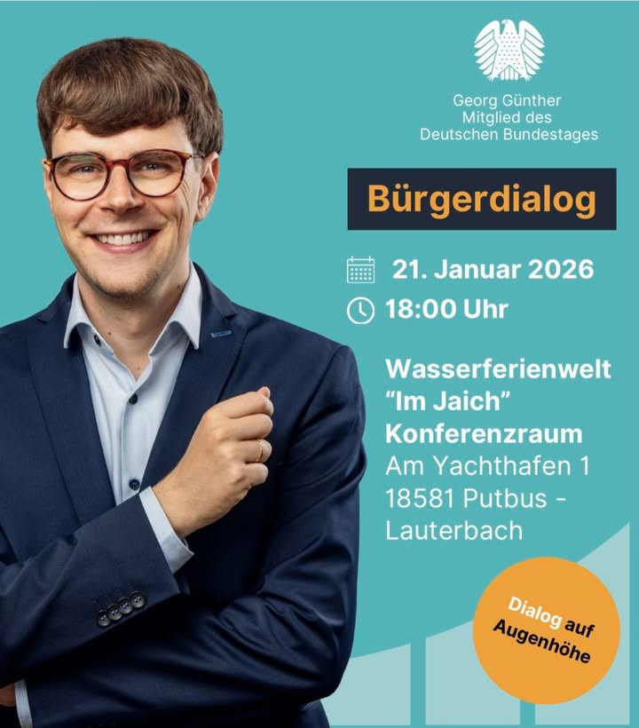 Wir freuen uns, unseren Bundestagsabgeordneten Georg Günther wieder bei uns in Putbus/ Lauterbach begrüßen zu dürfen.Vor einem Jahr war er noch als Kandidat hier und nun als Abgeordneter.Wir sind gespannt auf seine aktuellen Informationen aus der Bundespolitik.Außerdem werden auch unseren beiden Landtagskandidaten Birgit Mietzner und Holger Kliewe mit dabei sein.Alle Interessierten sind herzlich eingeladen!Wir freuen uns auf euch!#bu?rgerdialog #GeorgGünther #putbus #politik